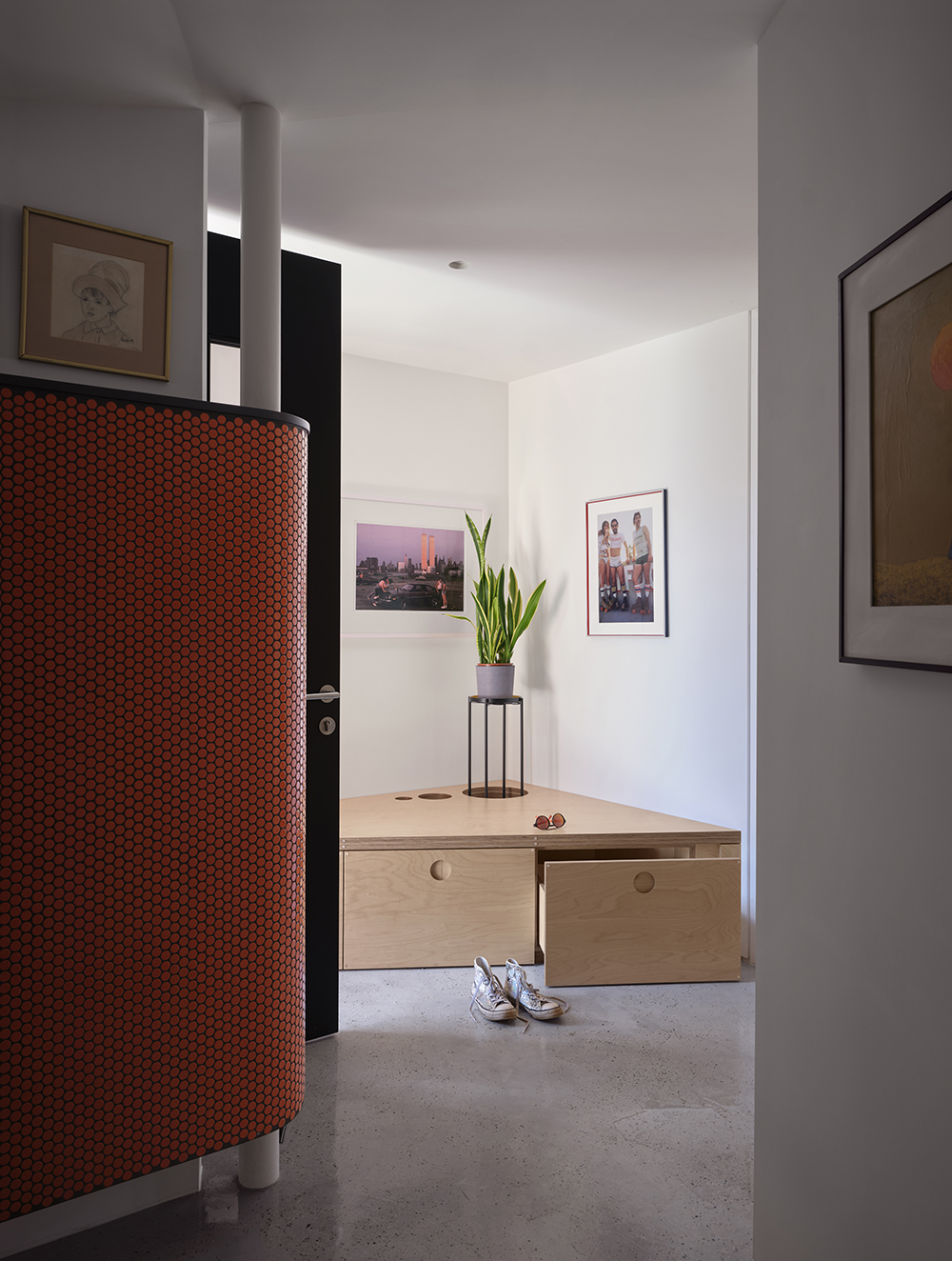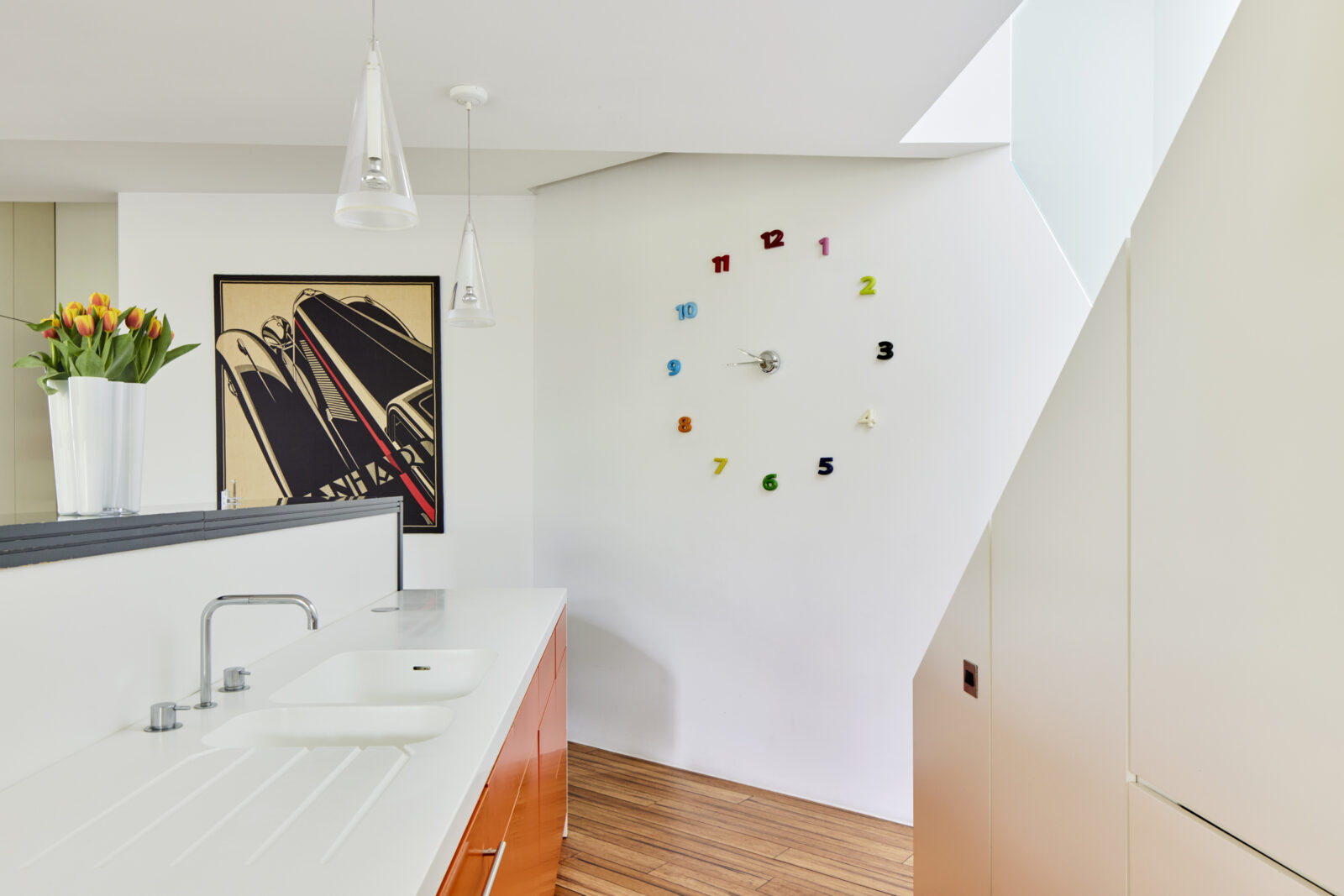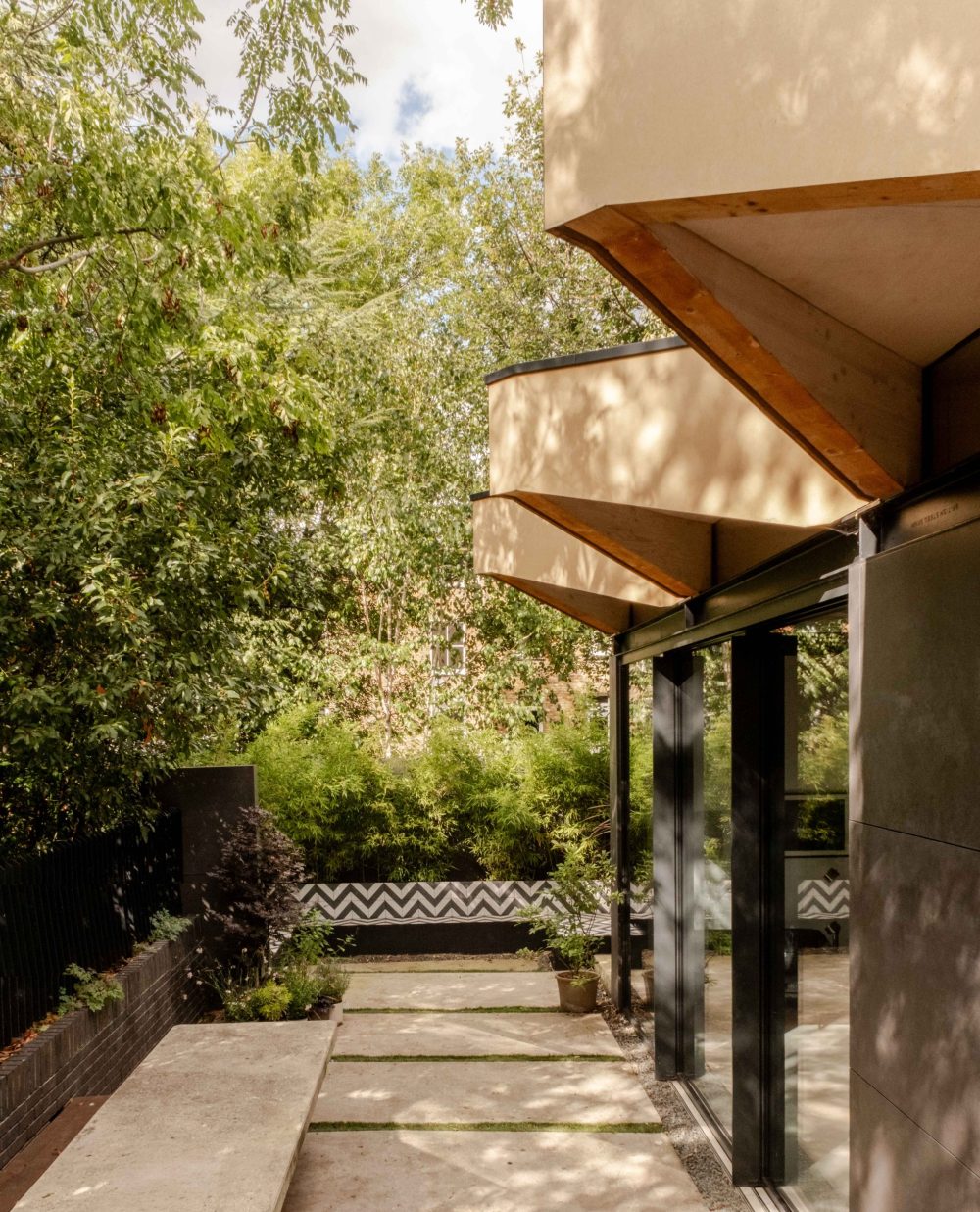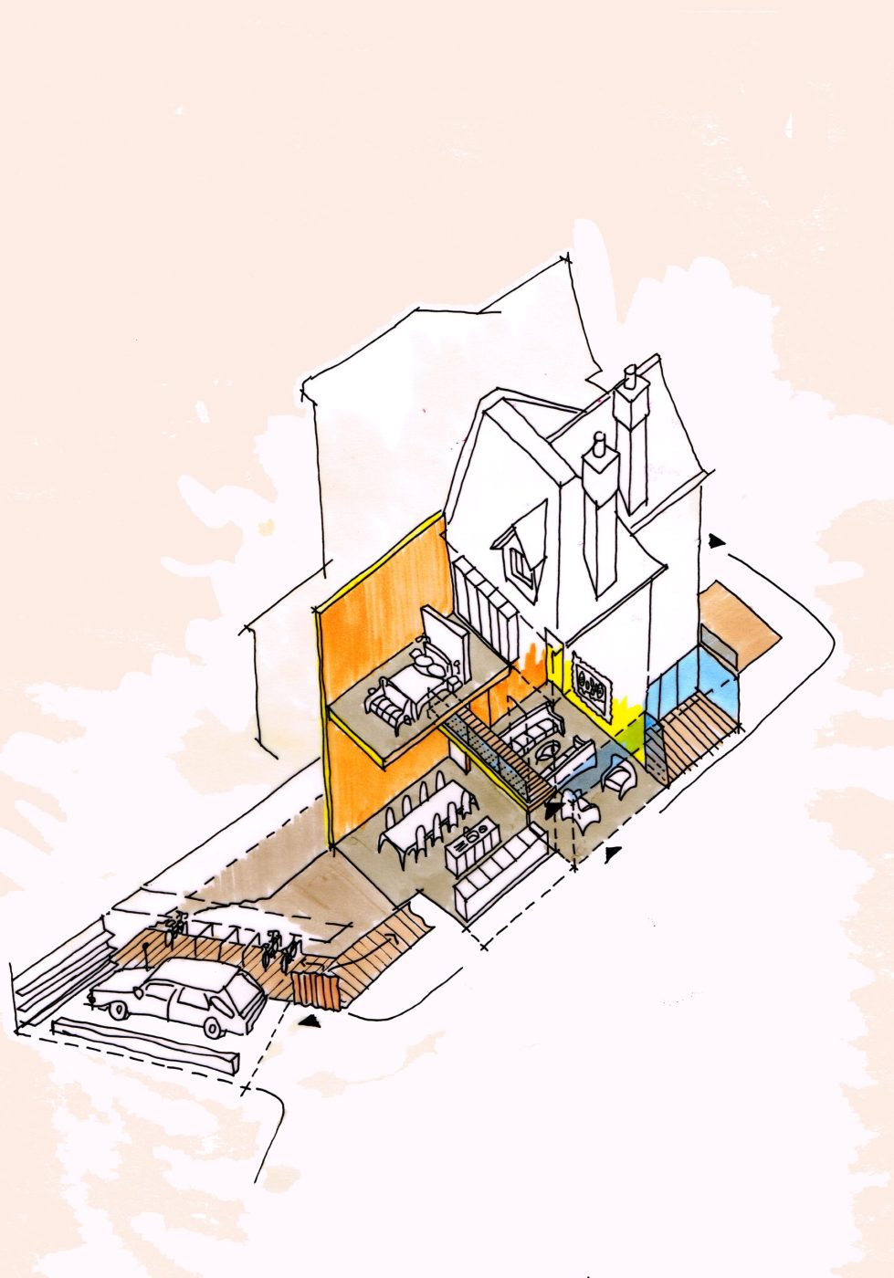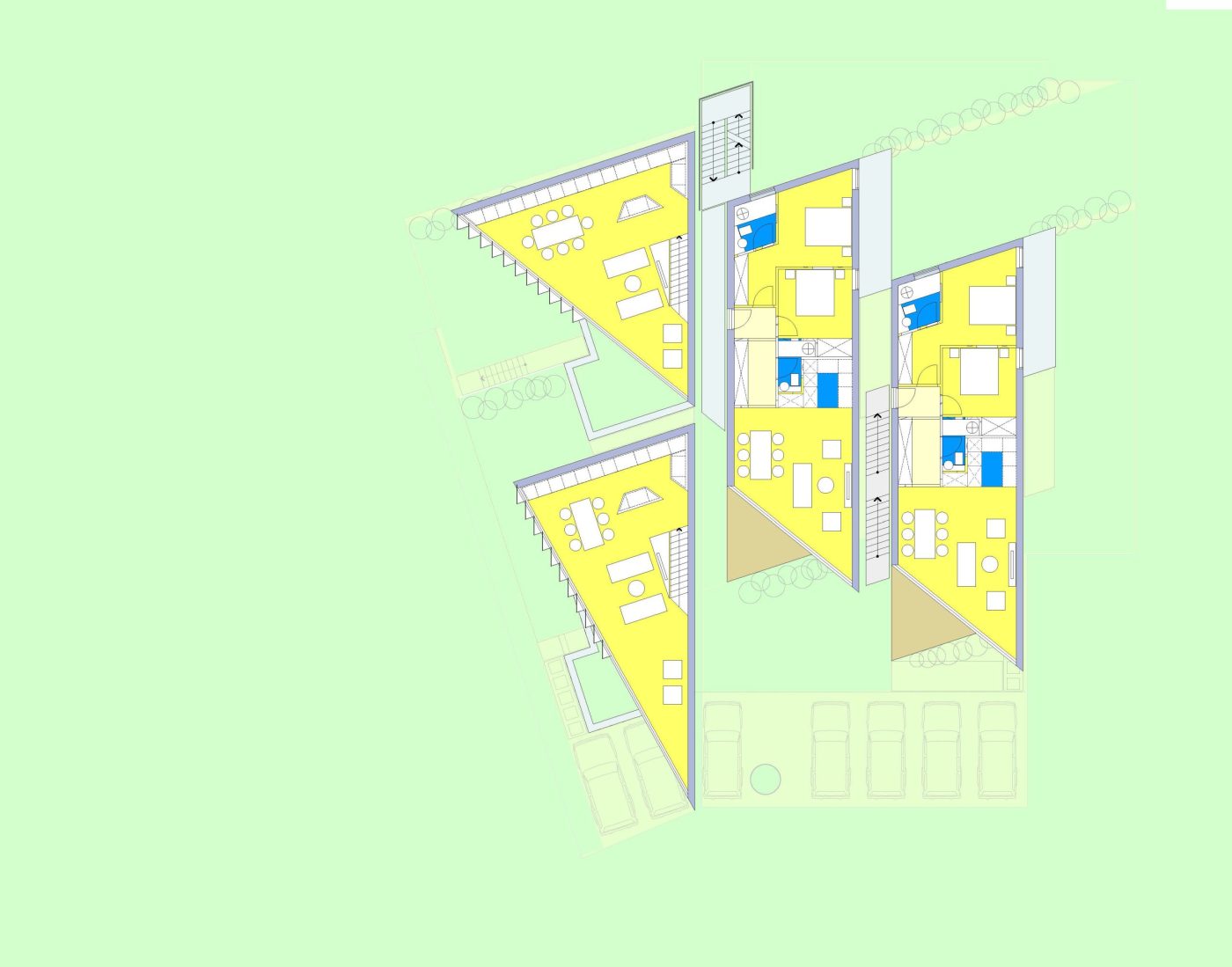 Really, really very clever. A really challenging space to make use of for even one home.. but two homes?… And not just any old houses – ones with functional, beautiful and striking schemes